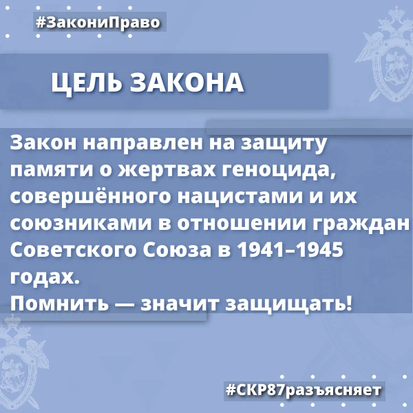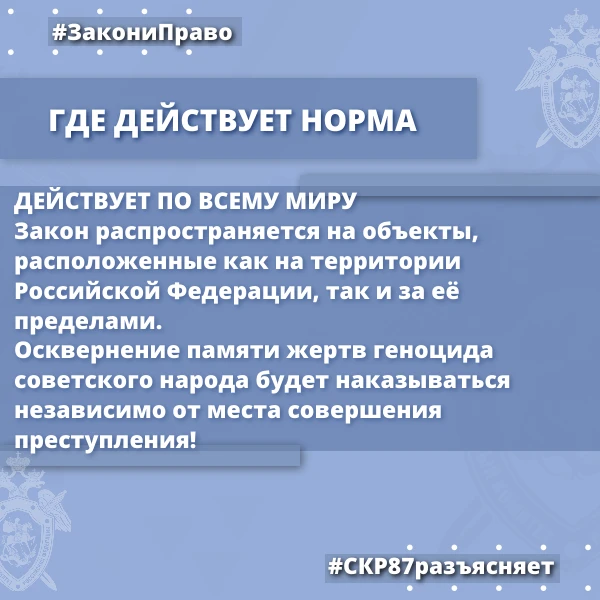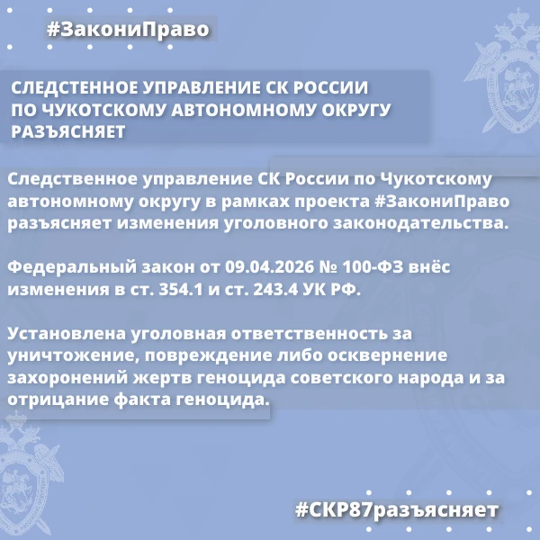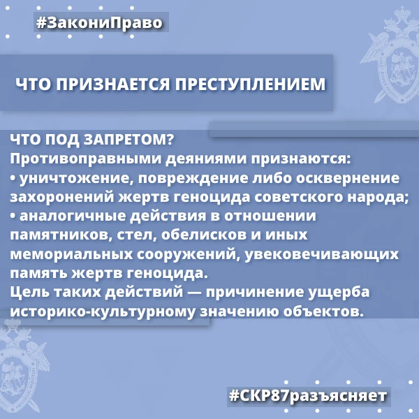 Следственное управление СК России по Чукотскому автономному округу разъясняет ответственность за уничтожение, повреждение либо осквернение захоронений жертв геноцида советского народа и за отрицание факта геноцида советского народа