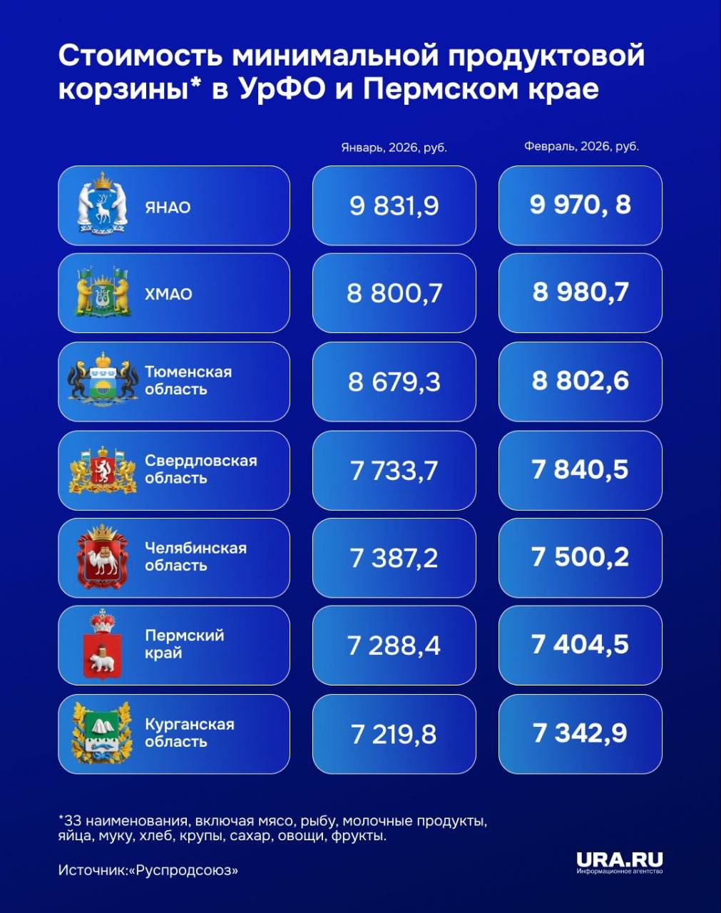Стоимость месячной минимальной продуктовой корзины в феврале выросла на 1,3% по сравнению с январем и составила 7 611,7 рубля — это в среднем по России. Специалисты «Руспродсоюза» учитывали 33 наименования, в том числе хлеб, мясо, рыбу, молочные продукты, яйца, крупы, муку, сахар, овощи и фрукты.