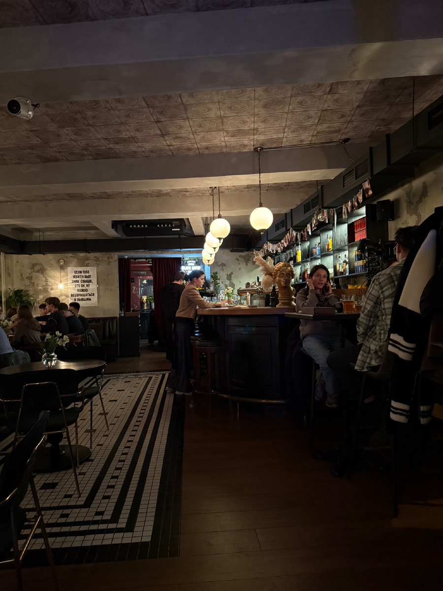 Интерьер поражает лофтовым дизайном с бетонными стенами и небольшими столиками. В пространстве гремят колонки, играющие от Билана до Aerosmith, создавая атмосферу, которая зазывая прохожих войти. Однако шум может быть немного некомфортным, а освещение — довольно тусклым.