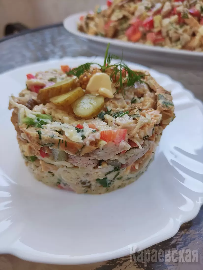 Этот салат станет отличным дополнением к любому праздничному столу или простому ужину. В его вкусе гармонично сочетаются свежесть овощей и насыщенность куриного мяса, создавая восхитительное кулинарное впечатление.