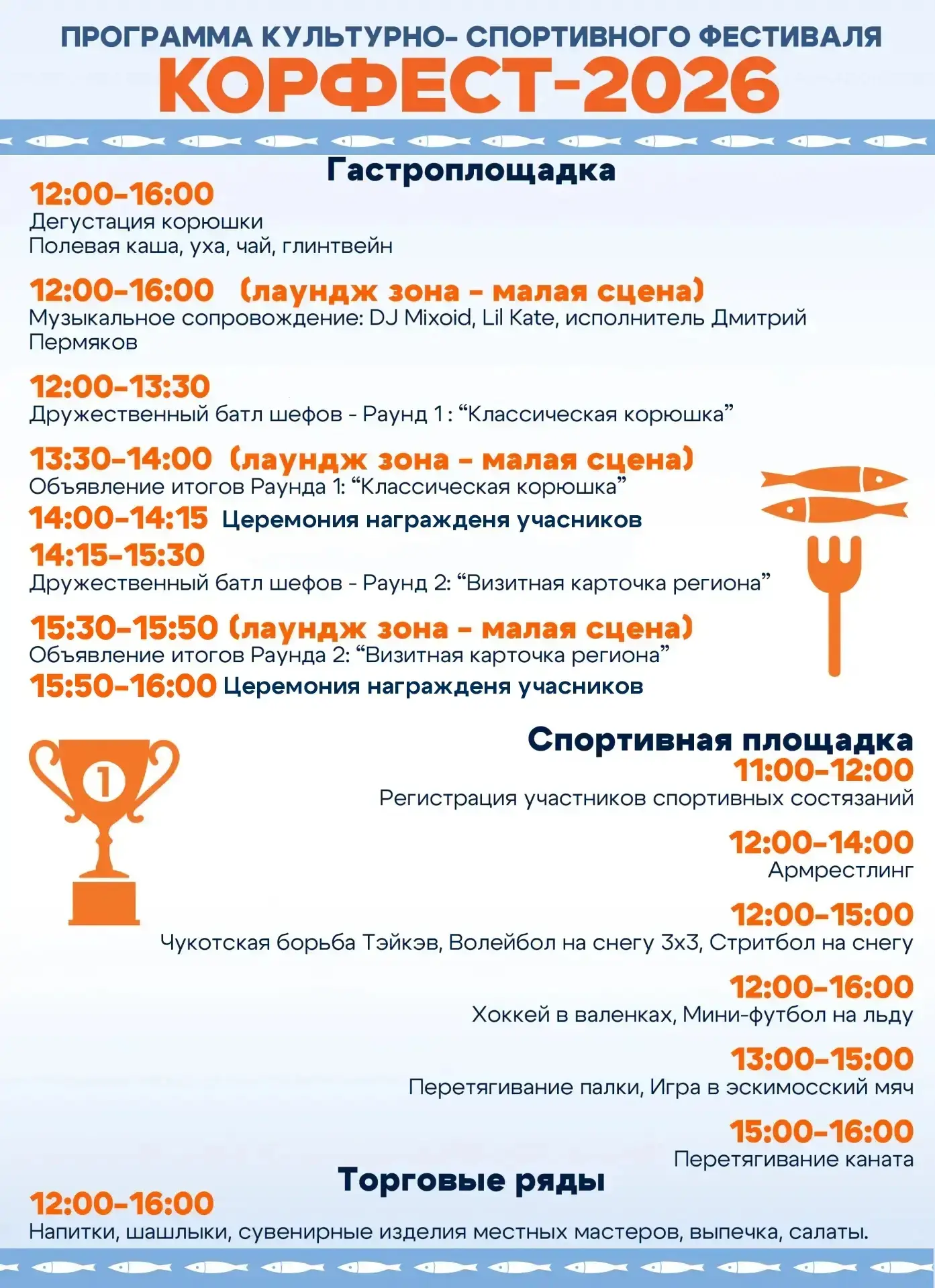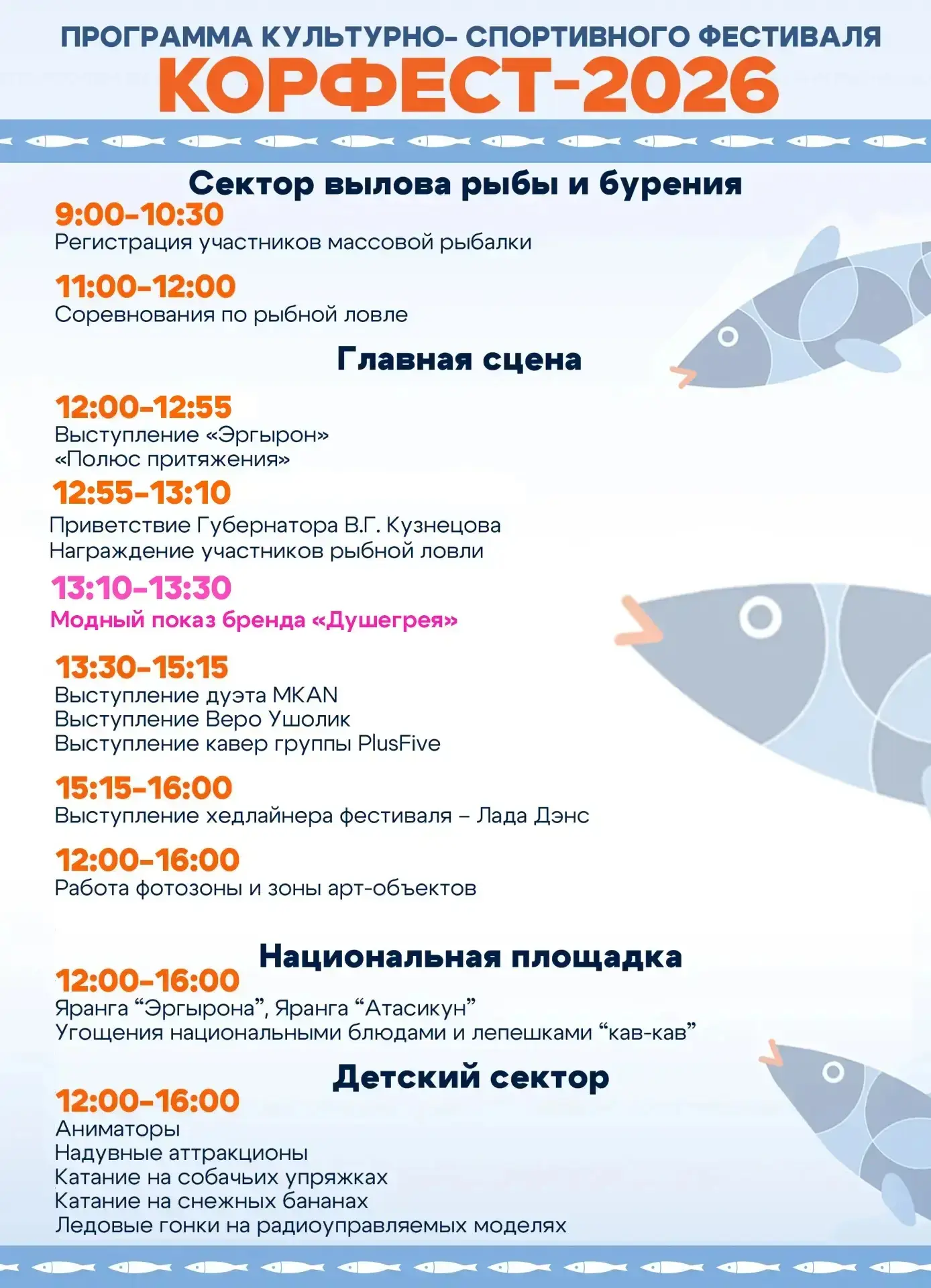 Не пропустите массовую рыбалку, дружественный батл шеф-поваров «КорФест: КОРЮШКА — 360°», большую культурную программу.
