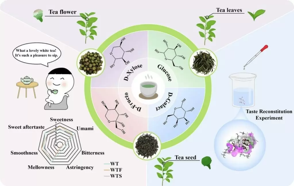 Исследователи связали приятность нового вида белого чая с четырьмя моносахаридами: D-фруктозой, глюкозой, D-галактозой и D-ксилозой. Особенно D-фруктоза в значительной мере усиливает вкус чая, что делает его более привлекательным для потребителей. Чем выше содержание этих сахаров, тем более насыщенным и приятным оказывается конечный продукт.