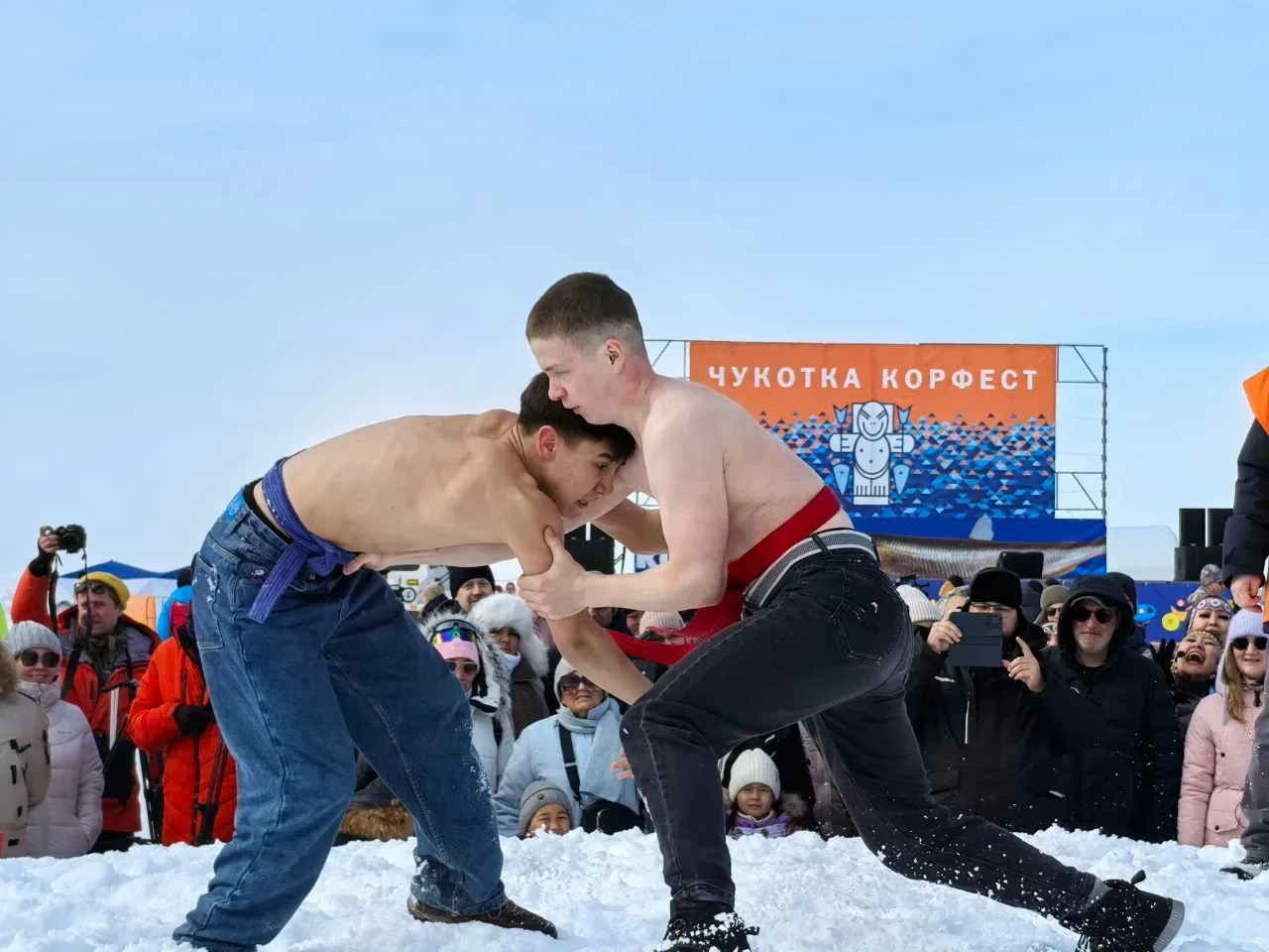 Спорт: армрестлинг, чукотская борьба «Тэйкэв», перетягивание каната и палки, эскимосский мяч, снежные волейбол и стритбол, хоккей в валенках, мини-футбол.