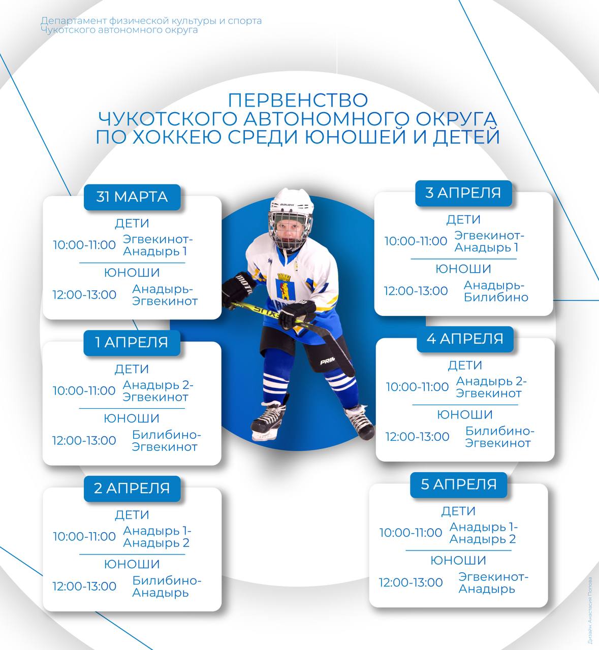 С 31 марта по 5 апреля пройдут главные хоккейные баталии года —чемпионат Чукотки по хоккею памяти Роберта Альбертовича Депоняна.Соревнования разделены на несколько блоков:Большой кубок«ДинамоАнадырь» (ГО Анадырь) и «Луч»...
